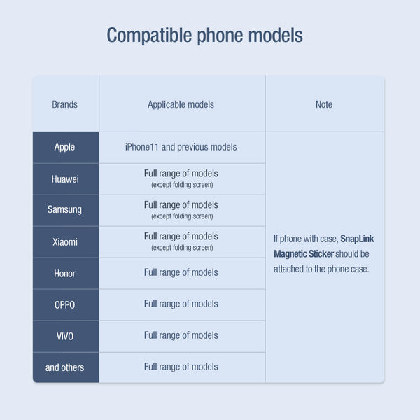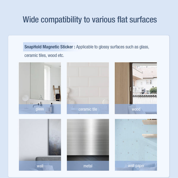 The magnetic kit includes both SnapHold and SnapLink magnetic stickers. SnapLink sticker gives the phone magnetic function and if used in combination with SnapHold sticker you can snap your phone onto general surfaces such as walls, mirrors, windows or car interiors and free your hands from the burden. This kit is widely compatible with Apple and Android smartphones and both products included are made from premium PU leather which is smooth and durable. The footprint of SnapLink and SnapHold is also very minor and therefore you can handily take them with you on the go. The quality NdFeB magnet inside ensures a sturdy magnetic connection and freely-adjustable orientations while the select 3M glue guarantees a residue-free yet firm stickiness.